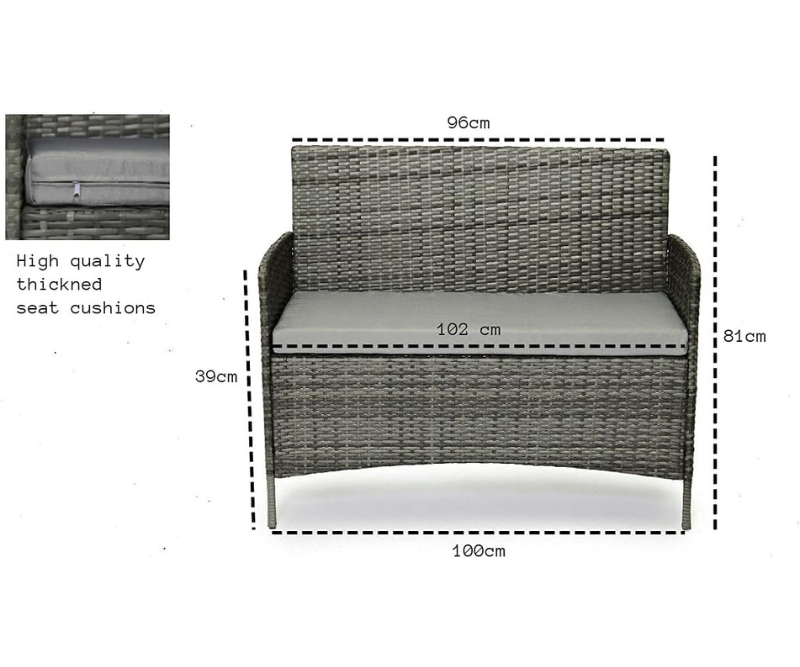 • Contenuto: 1 panca a due posti, 2 sedie singole, 1 tavolino da caffè e 3 cuscini per seduta.