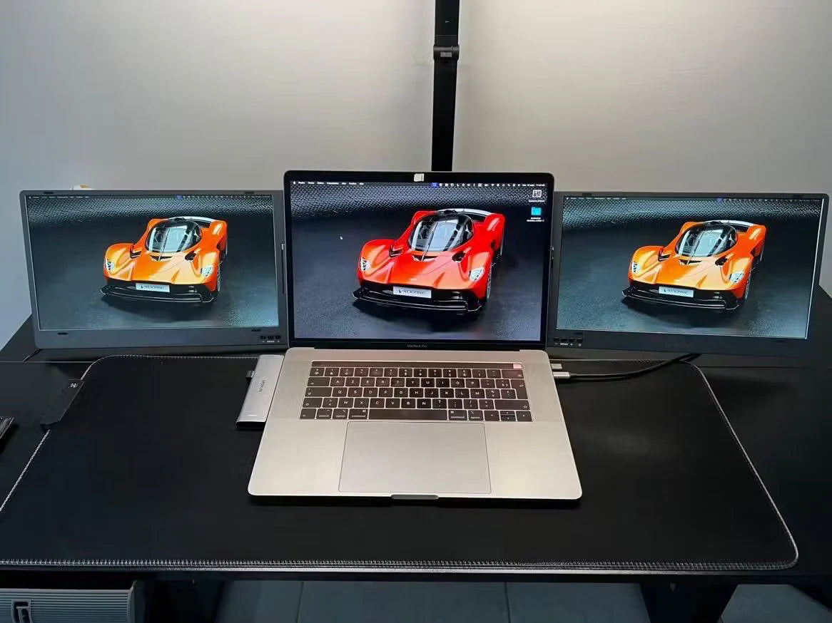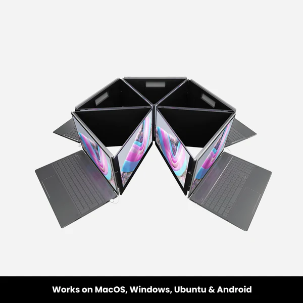 Progettati con innovazione, i Doppi Schermi Portatili formano una configurazione triangolare elegante — ideale per riunioni di team e progetti collaborativi. Condividi il tuo lavoro con facilità con chi ti circonda.